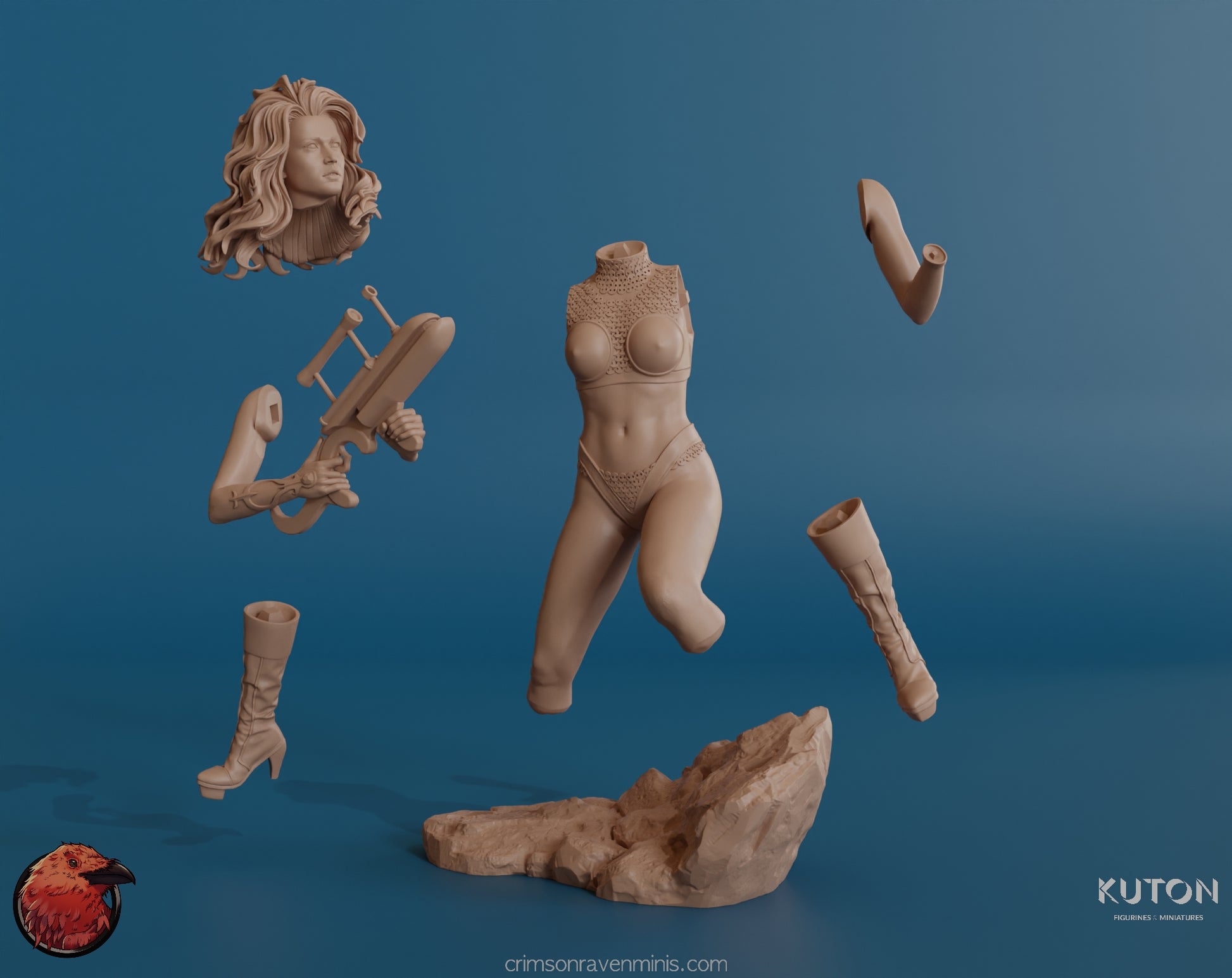 The model comes complete with her trademark weapon, ready to take on whatever challenges come her way. The rock base upon which she stands adds to the realism of the scene, suggesting a rugged, unexplored planet surface.