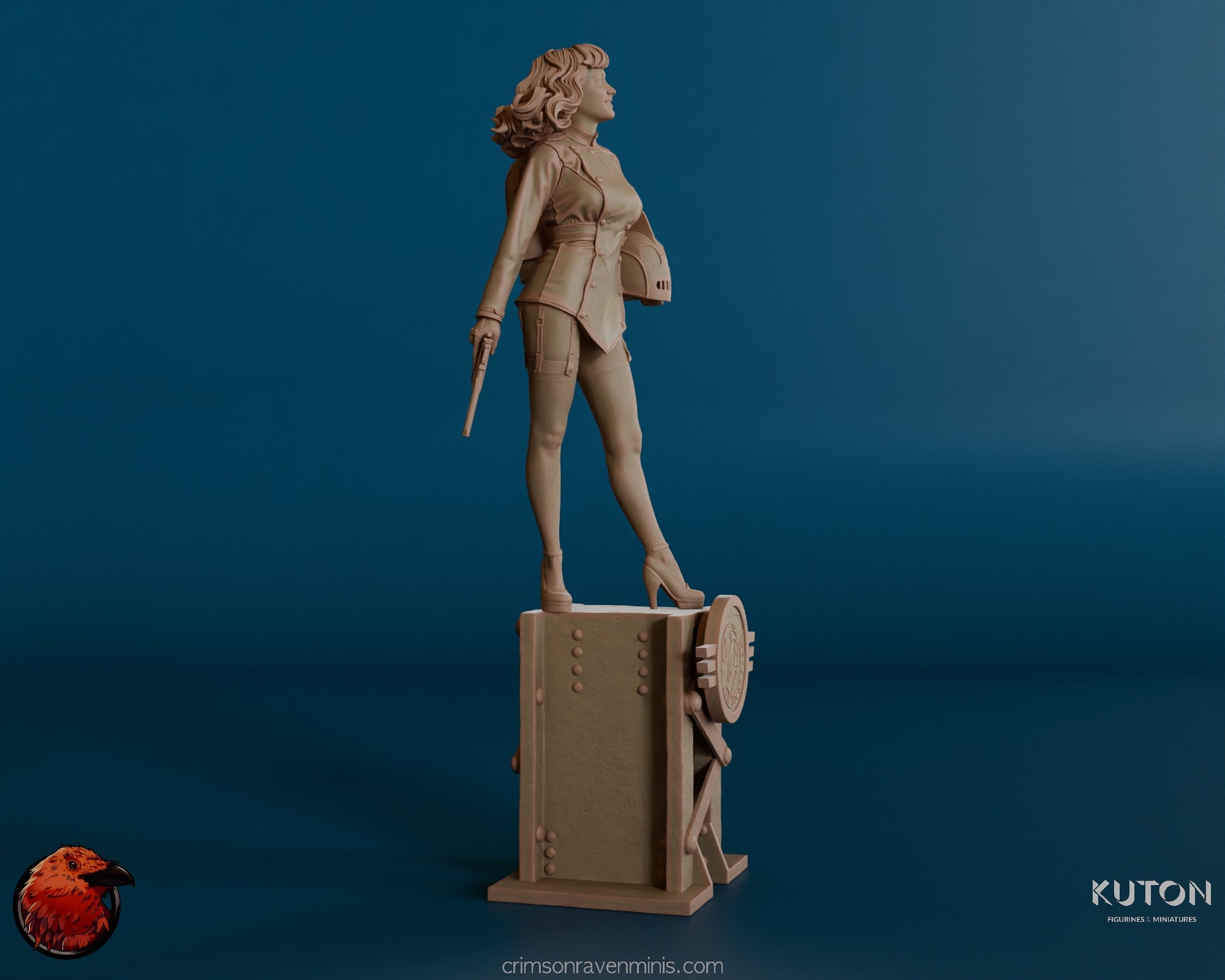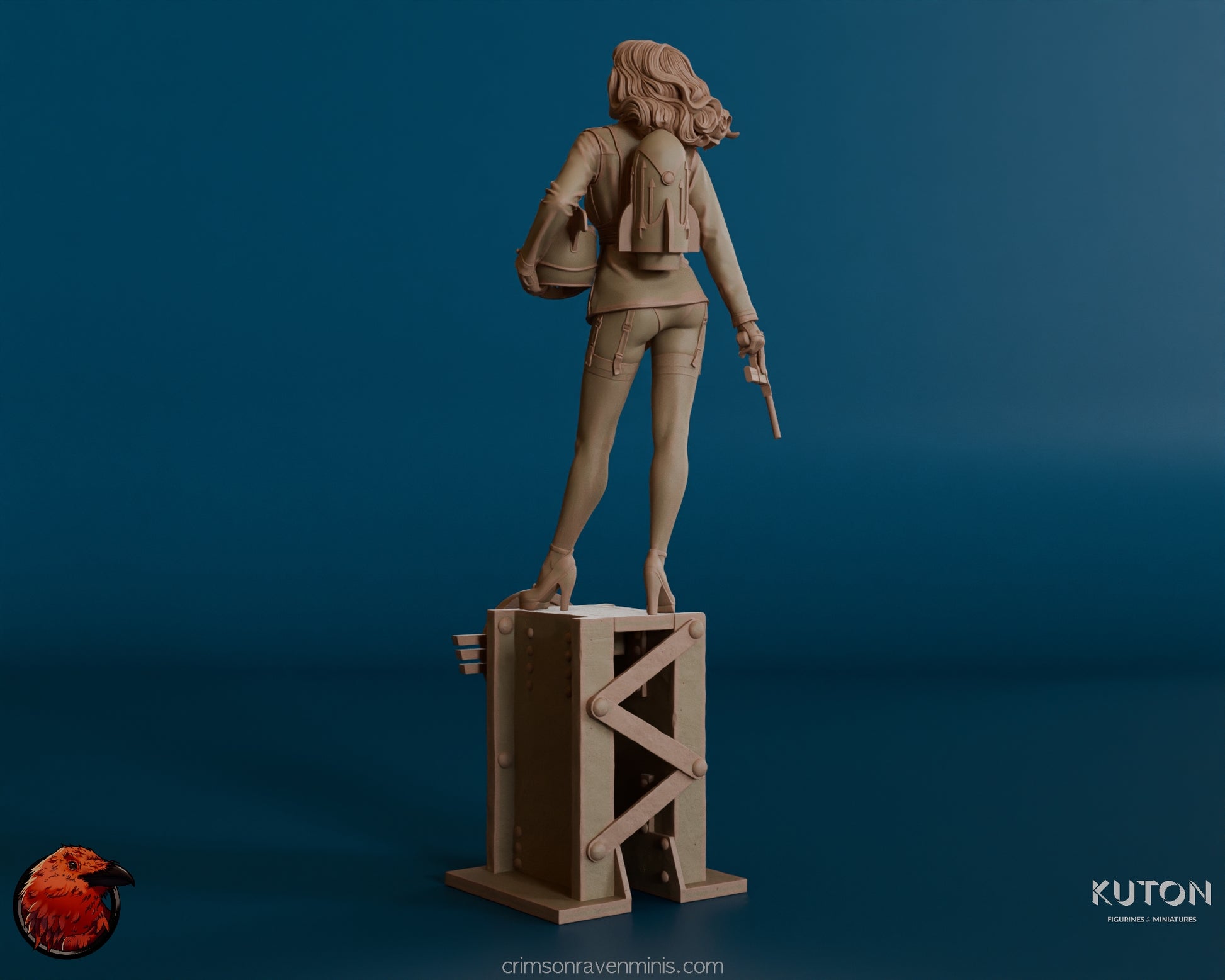 In her right hand, she confidently holds a Mauser C96 pistol, embodying the daring spirit of adventure. Nestled under her left arm is the iconic Art Deco-inspired Rocketeer helmet, a symbol of courage and high-flying heroism. Completing her ensemble is an art-deco inspired rocket pack resting on her back.